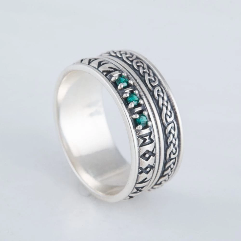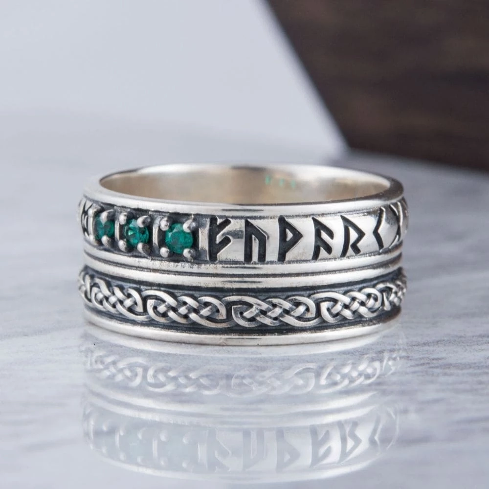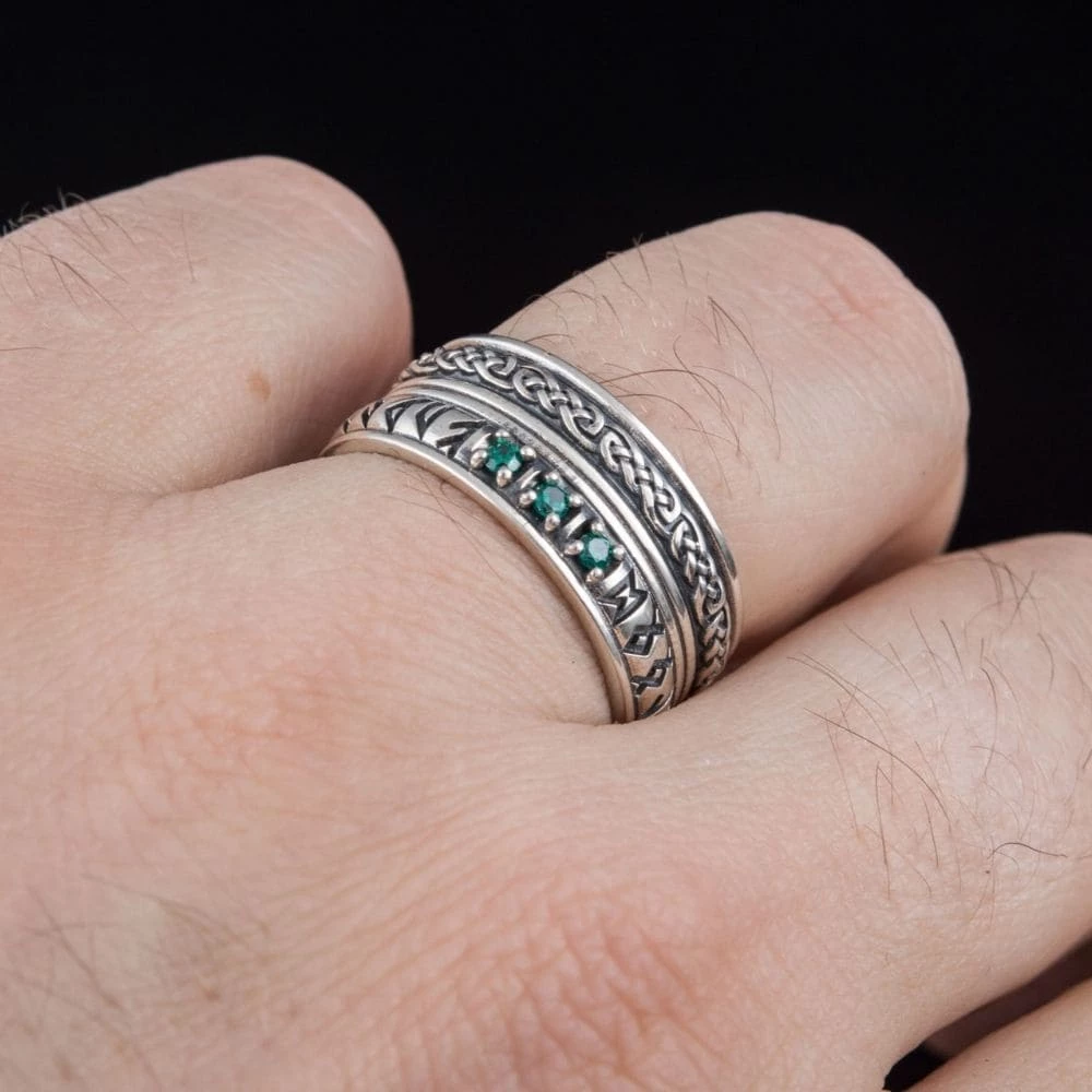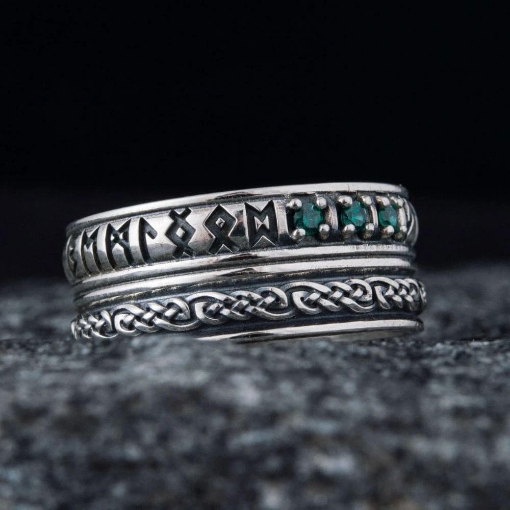 Cet anneau en argent massif est décoré d’inscriptions runiques et de motifs entrelacés scandinaves. Le tout est complété par trois pierres de zircon cubique vertes qui ajoutent une touche unique à ce bijou viking d’exception.
