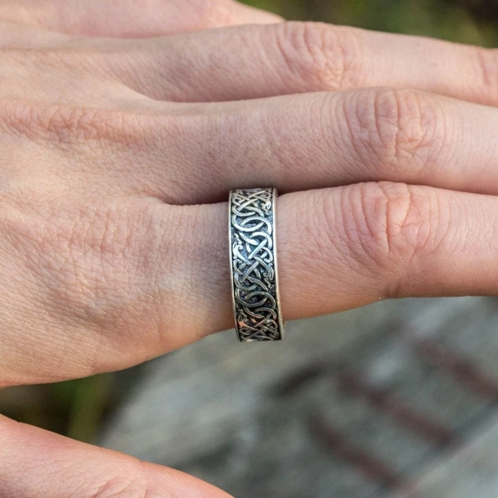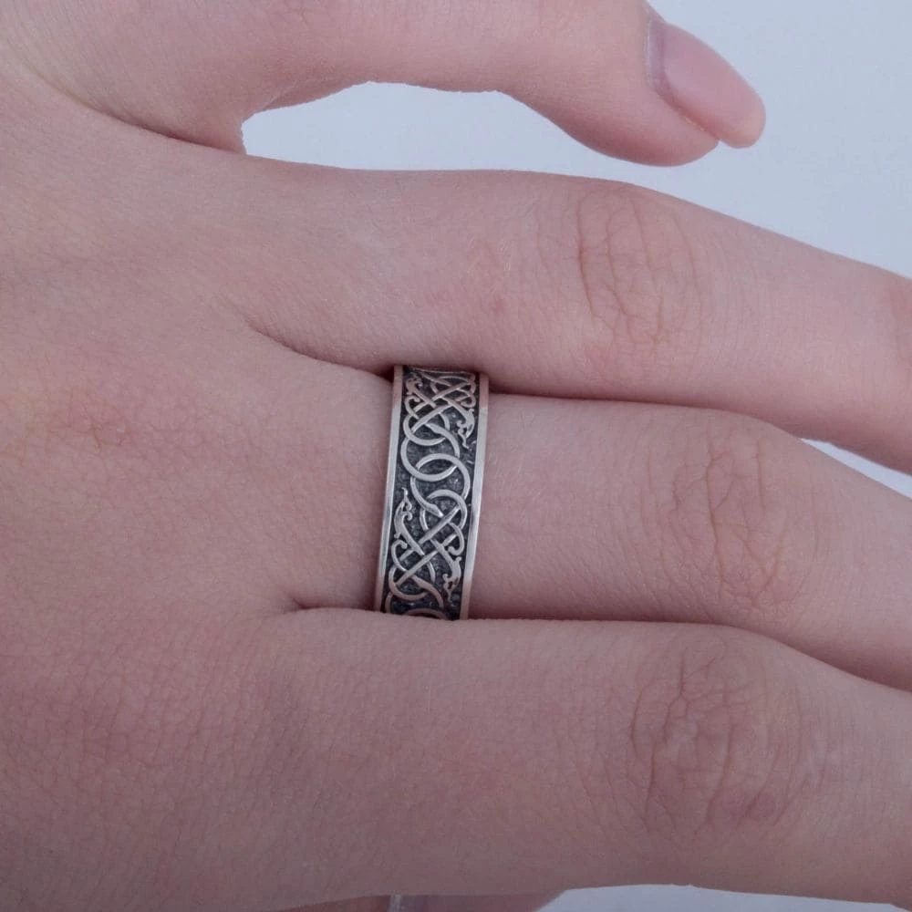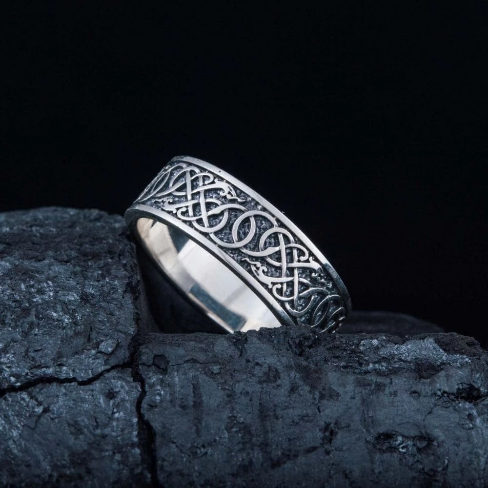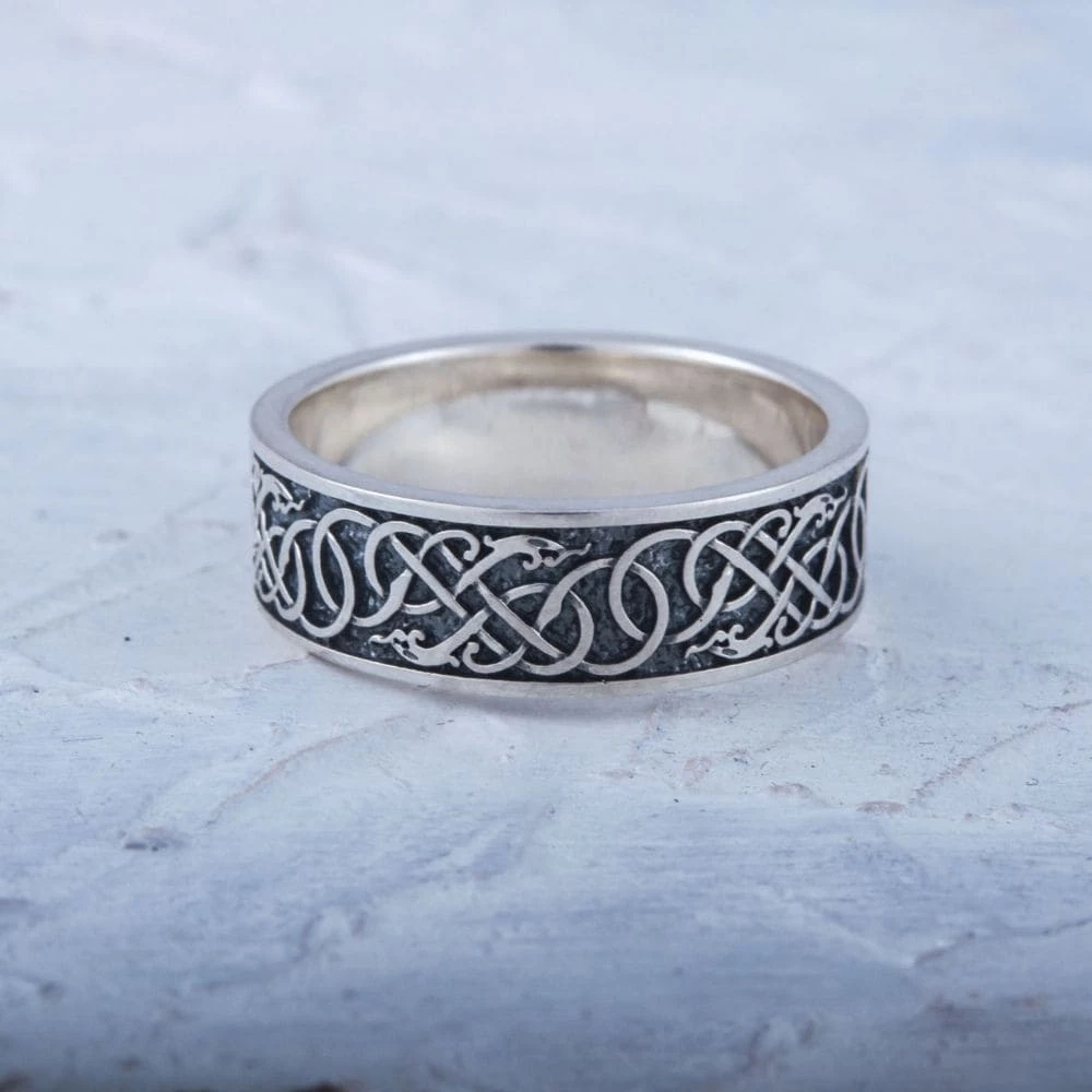Cet anneau en argent sterling est décoré d’un serpent entrelacé. Le design s’inspire des motifs entremêlés que l’on retrouve souvent dans l’art viking. La figure du serpent illustrée sur cet anneau représente le serpent Jörmungand. Dans la mythologie ce serpent de mer géant était le fils du dieu Loki et de la géante Angrboda.