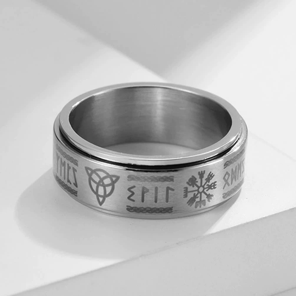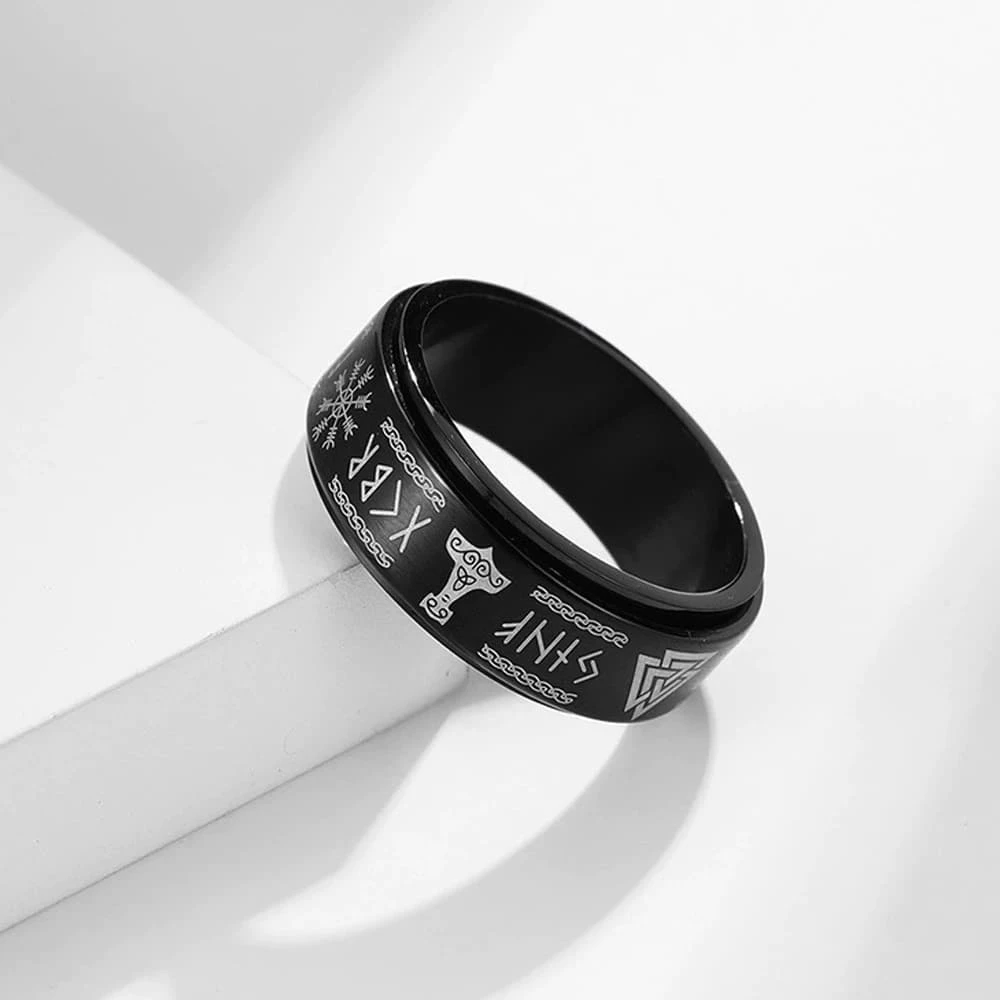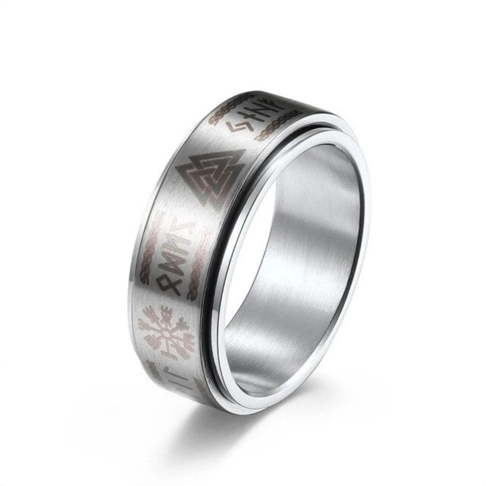 Cet anneau au design et composé d’une surface rotative est orné des plus fameux symboles vikings.