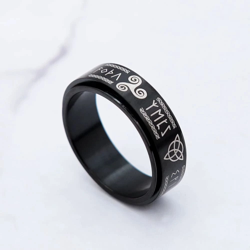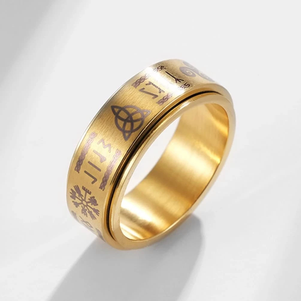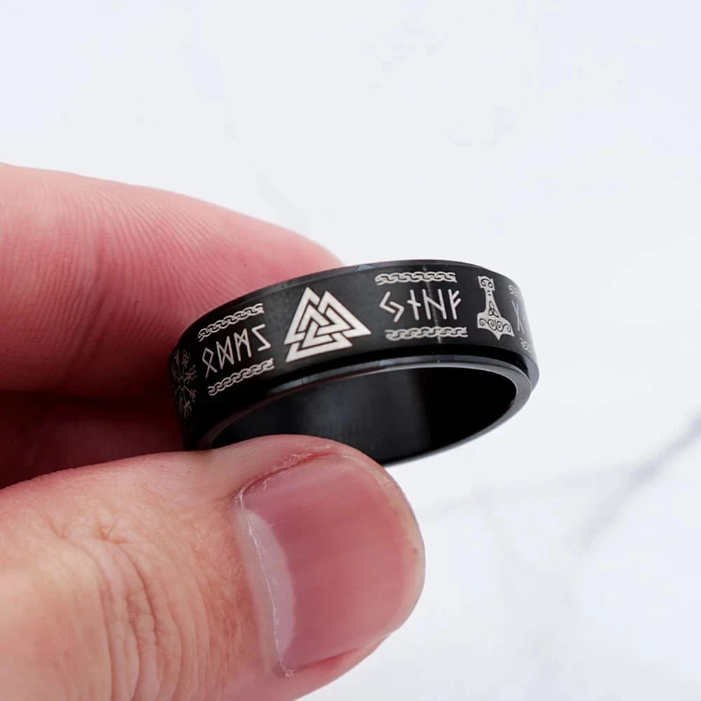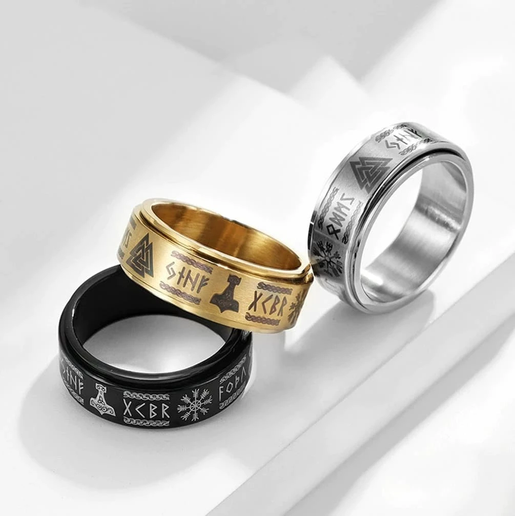 Cet anneau au design et composé d’une surface rotative est orné des plus fameux symboles vikings.