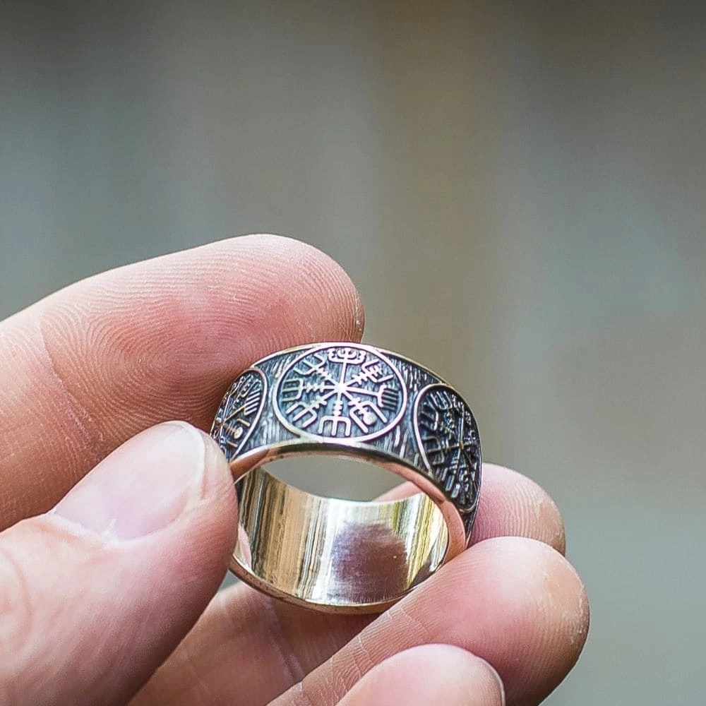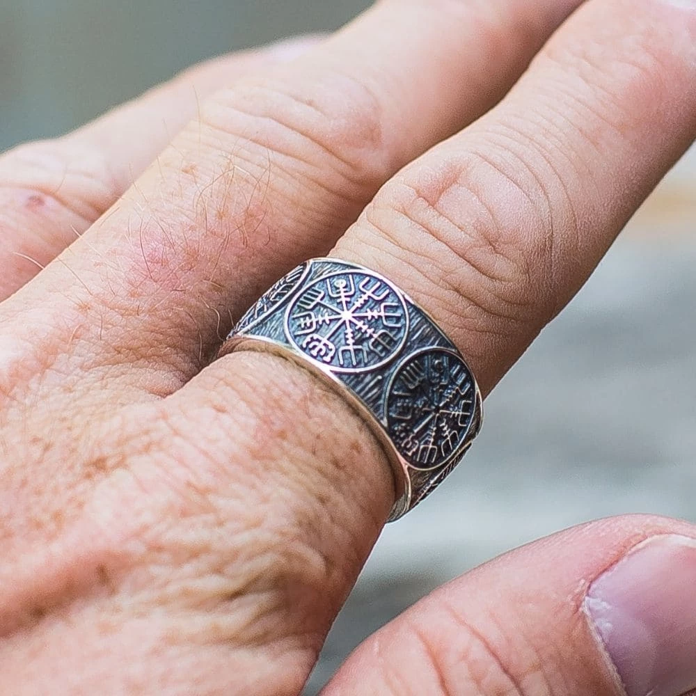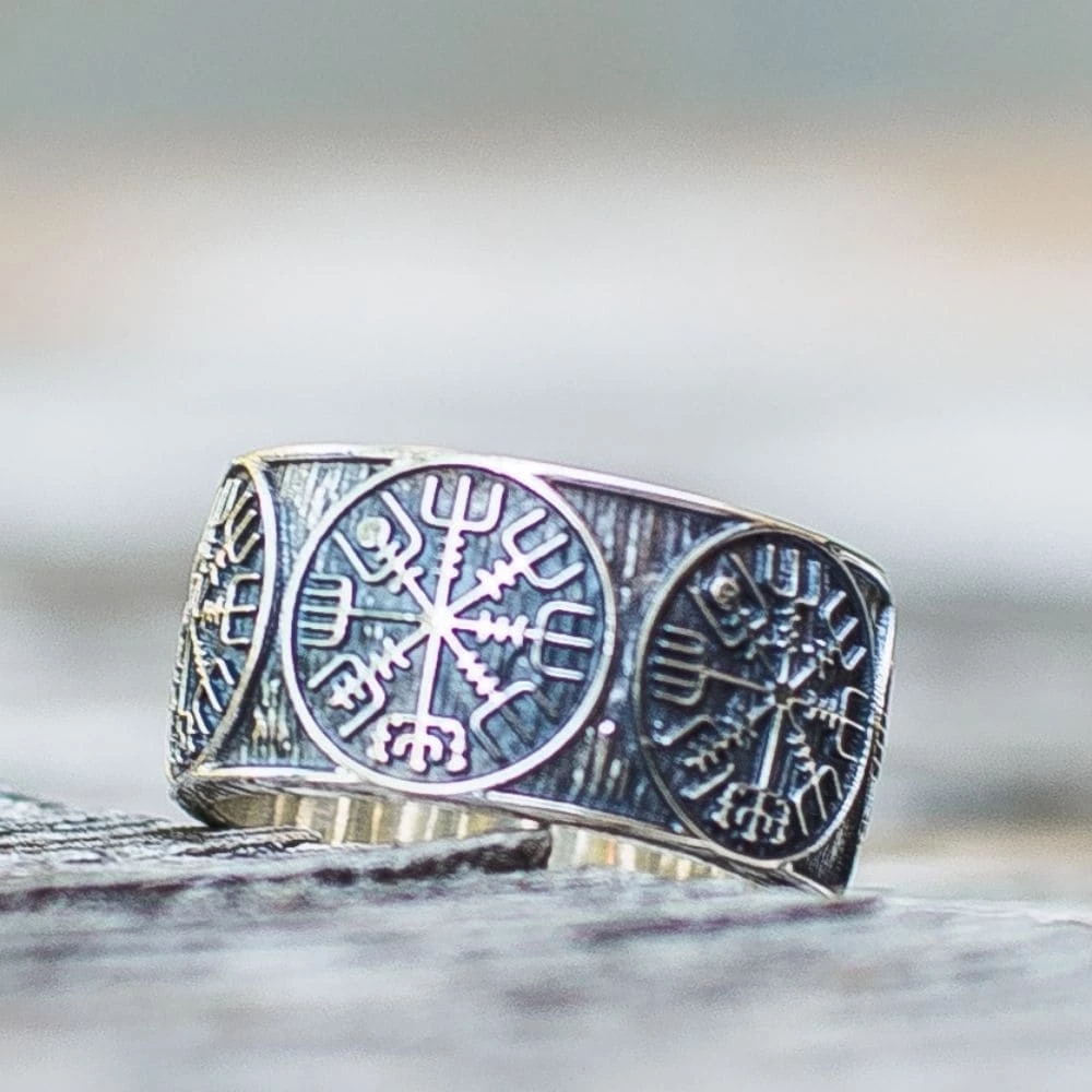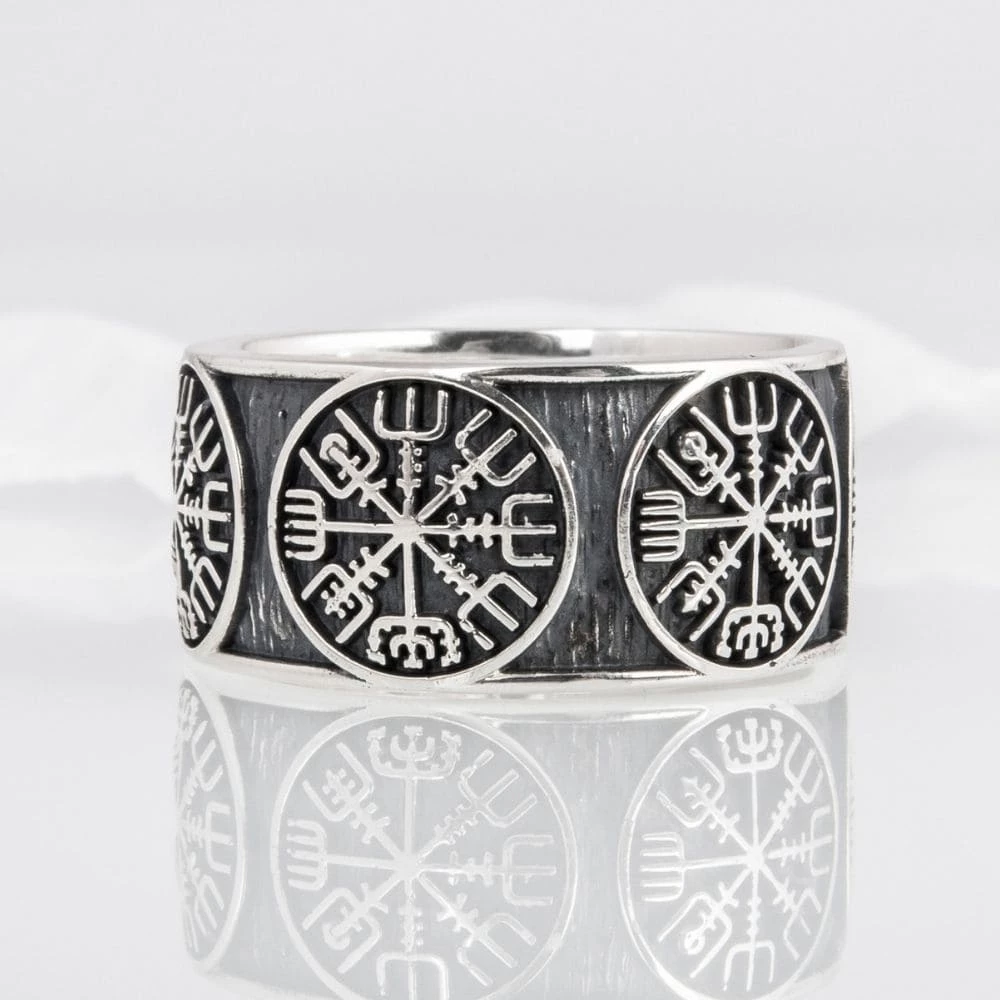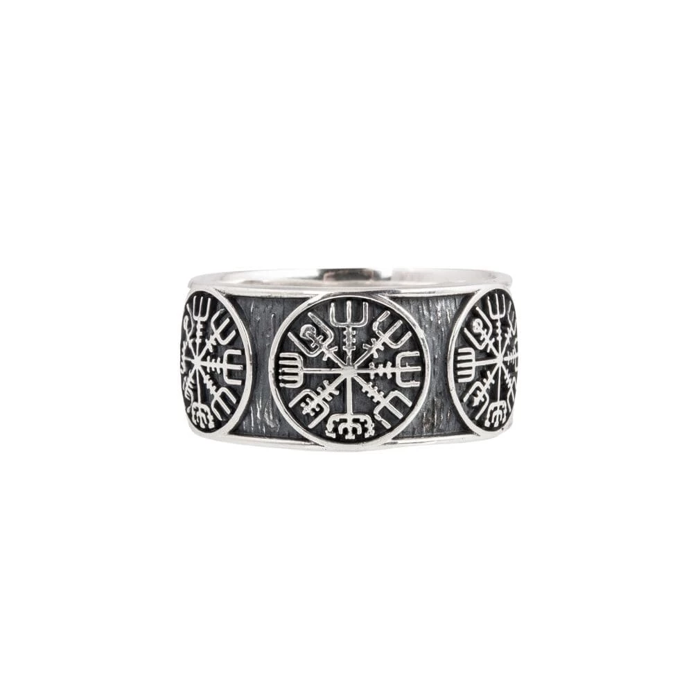 Cet anneau en argent massif est décoré du mystérieux symbole Vegvisir. Cet ancien et mythique symbole nordique était composé de huit branches pointant tout vers l’un des points cardinaux.