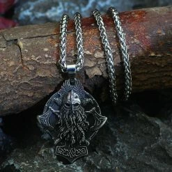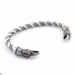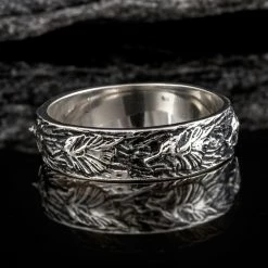 Cette bague en argent est une véritable bague de guerrier viking. La chevalière est décorée d’une tête de squelette portant un casque à corne. La surface de la bague est ornée de deux haches entrecroisées. Le tout est complété par la présence du symbole Valknut ainsi que de motifs scandinaves entrelacés qui ornent magnifiquement cette bague en argent faite à la main.