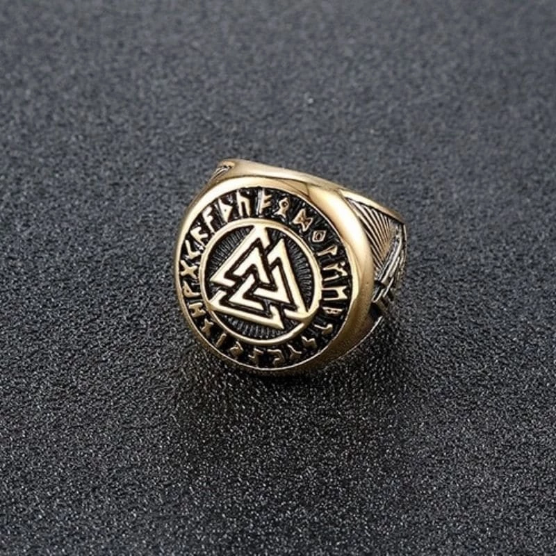 Sur cette bague en bronze figure le symbole Valknut, symbole étroitement associé aux guerriers morts au combat, les armes à la main. Découvert sur des stèles vikings, ce symbole odinique peut également être associé au Valhalla, la grande halle du dieu Odin. Ce lieu mythologique accueille les guerriers tombés au combat. Lorsqu’une bataille prend fin, les Valkyries descendent du ciel et récupèrent les âmes des guerriers les plus valeureux pour les mener auprès des dieux, à Asgard.