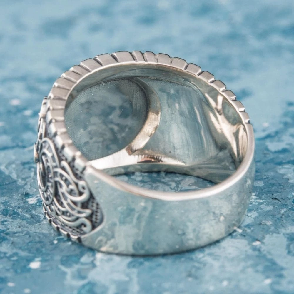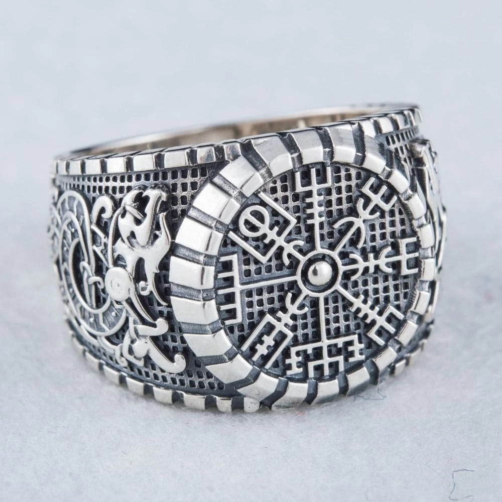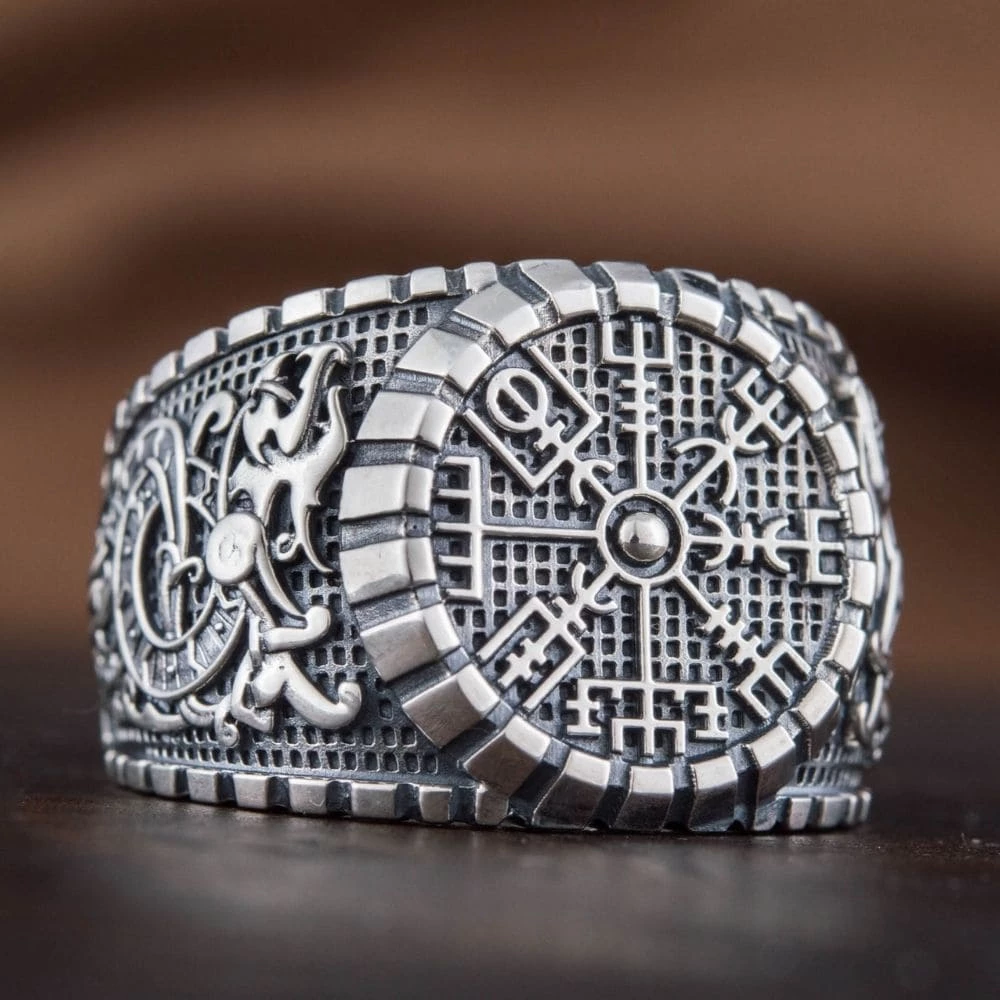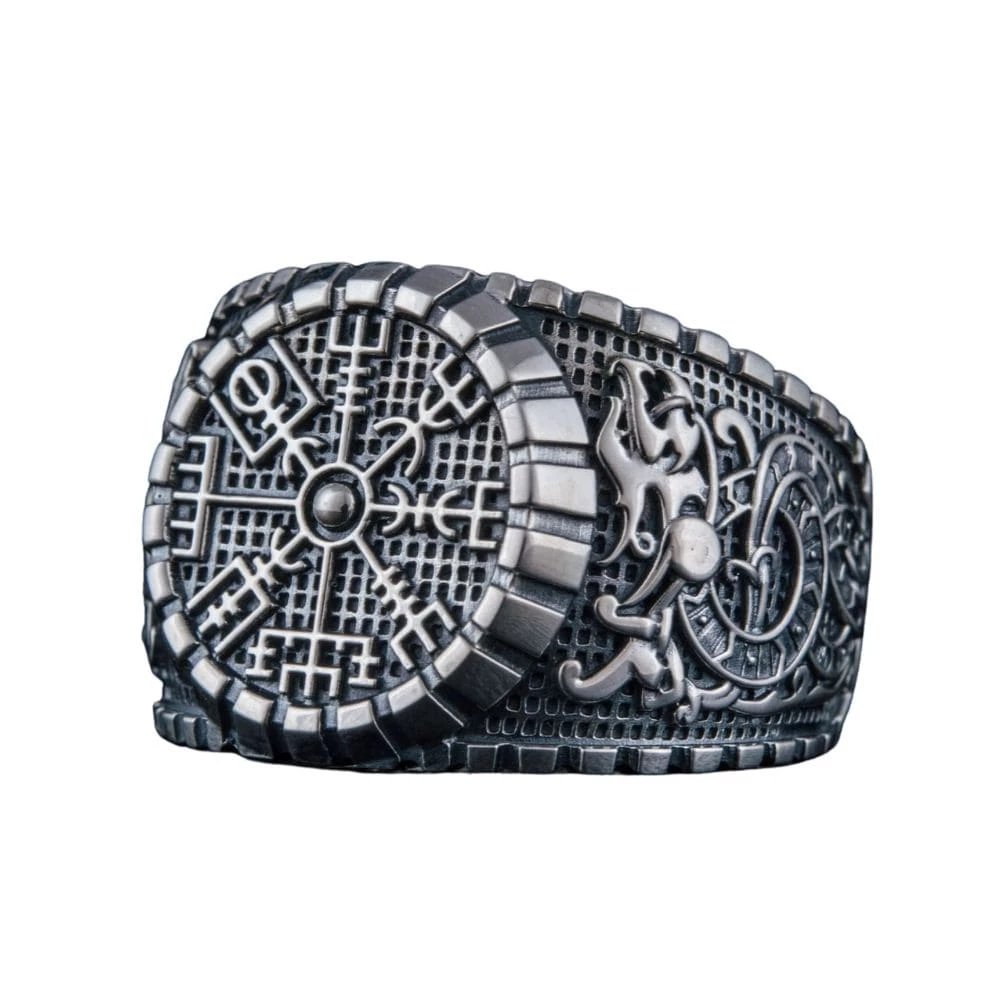Bague Vegvisir en argent décorée de symboles nordiques entrelacés. Le symbole du Vegvisir est un symbole viking magique composé de huit branches. Cet ancien emblème nordique devait permettre aux voyageurs de parvenir à destination en toute sécurité. Les Vikings le peignaient sur leur navire afin de retrouver leur route en mer et regagner leur foyer.