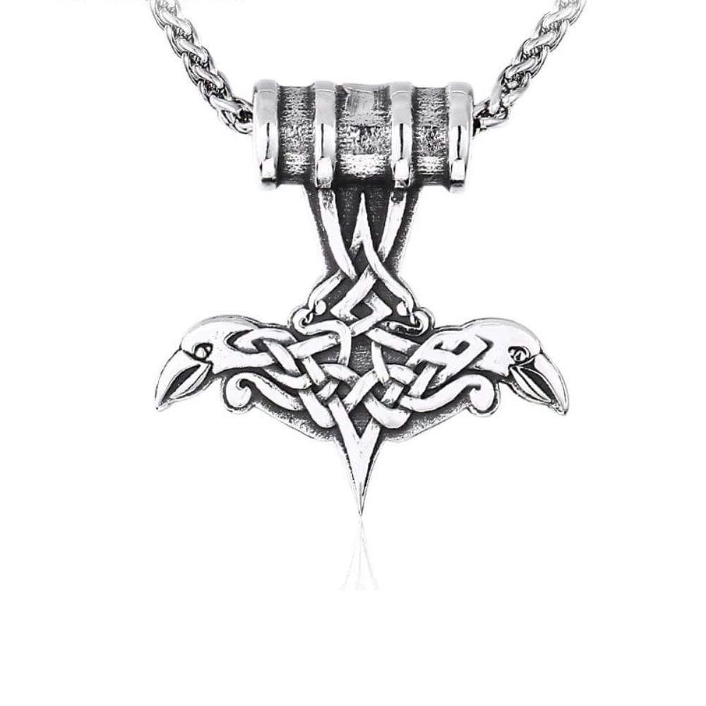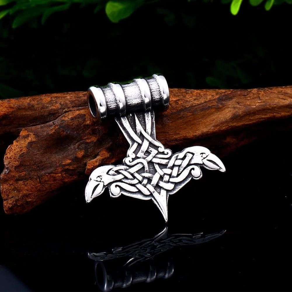 Ce pendentif associe deux des symboles les plus reconnus de la culture viking: le corbeau et le marteau de Thor. Les corbeaux sont ici reproduits de manière stylisée pour former un pendentif de marteau de Thor. Dans la mythologie nordique, Hugin (esprit) et Munin (mémoire) étaient les noms des deux corbeaux messagers chargés d’informer leur maître Odin.