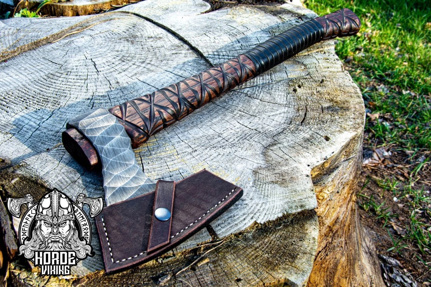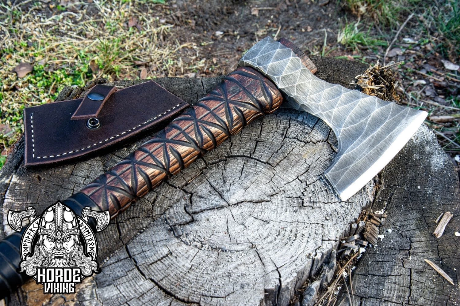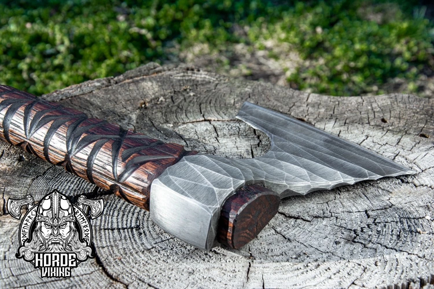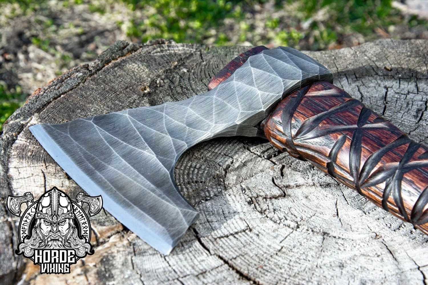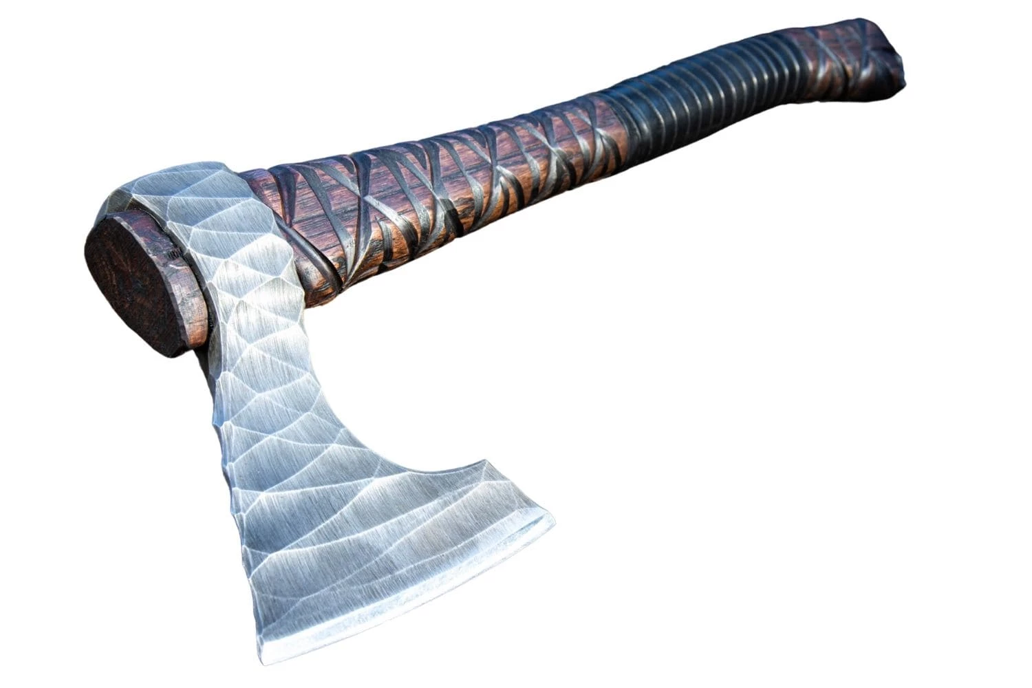 Cette hache est caractérisée par des motifs de rayures croisées décoratives. Son manche est fabriqué à partir de bois de frêne. Sa lame en acier à haute teneur en carbone lui procure une solidité sans équivalent. La tête de la hache est manipulée et travaillée avec habileté afin de procurer à la tête de la hache ces motifs de rayures si particulières.