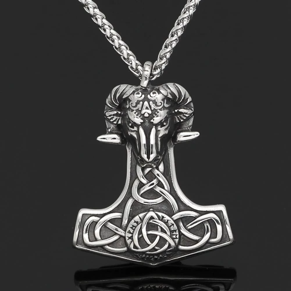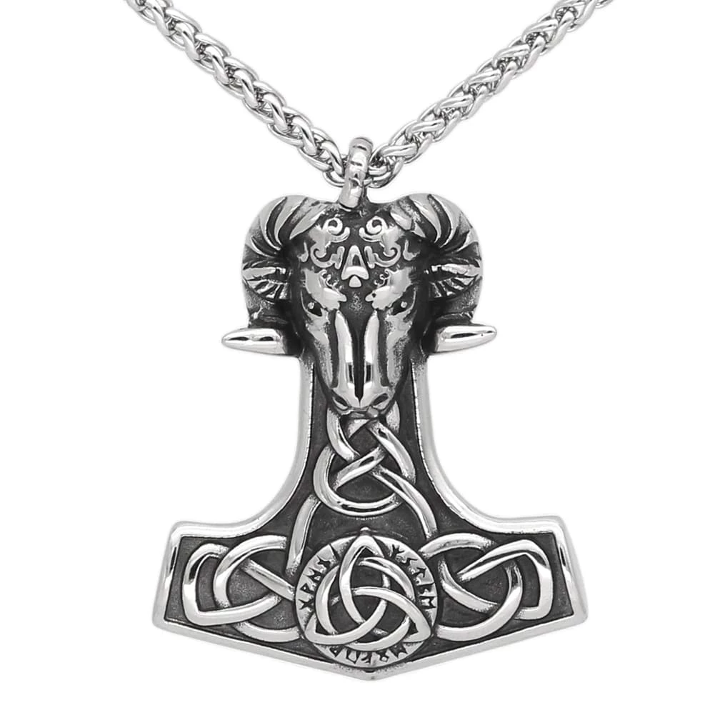 Ce collier en forme de marteau Mjolnir est décoré en son centre du symbole Triquetra et d’inscription runique. Le marteau est surmonté d’une tête de bélier.